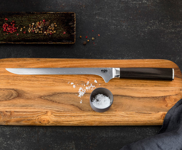 Filékniven har ett flexibelt knivblad som gör det enkelt att skära under skinnet och längs fiskens ben.
