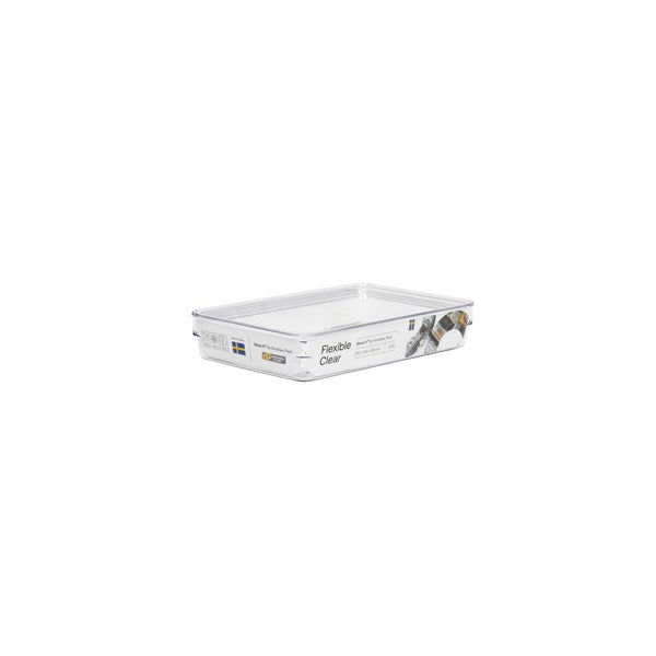 Överskådlig förvaringslåda i glasklar plast komplett med lock/bricka - att använda för t.ex. pålägg. Tillverkad i Sverige av livsmedelsgodkänd SAN-plast, fri från BPA och andra ftalater Klarar temperaturer från -40°C till +90°C. Volym: 0,8 liter. Mått (LxBxH): 23 x 140 x 40 mm. Tips för ökad livslängd! Maskindiska i överkorgen där det är längre ifrån värmeelementen i diskmaskinen. Undvik att värma i mikrovågsugn då lådan lätt uppnår högre temperaturer och riskerar att tappa sin form.