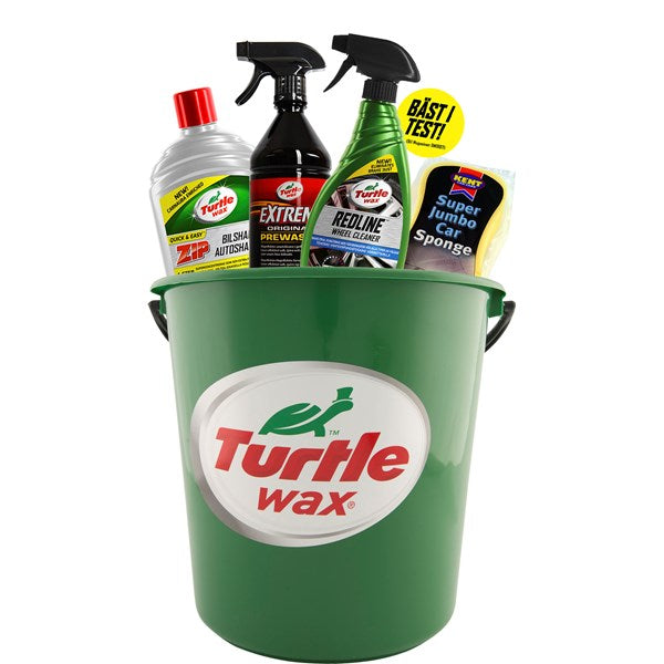 Bilvårdshink innehållande: Turtle Redline Wheel Cleaner, Turtle Extreme Prewash-T, Turtle Wax ZIP bilshampo samt en Jumbo svamp.