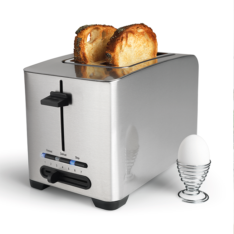 Brödrost 800 Watt i borstat stål med 7-gradig värmeskala. Brödrosten har uppvärmnings; stopp; och upptiningsknapp med indikatorlampa.